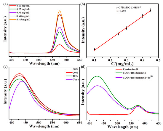 (a) Fluorescence spectra of different concentrations of rhodamine B under the excitation of 340 nm; (b) linear relationship between the concentration of rhodamine B and fluorescent intensity; (c) fluorescent spectra of N−SCQDs prepared with different dosages of amikacin sulfate; (d) effect of Fe3+ on the fluorescence of rhodamine B and N−SCQDs.