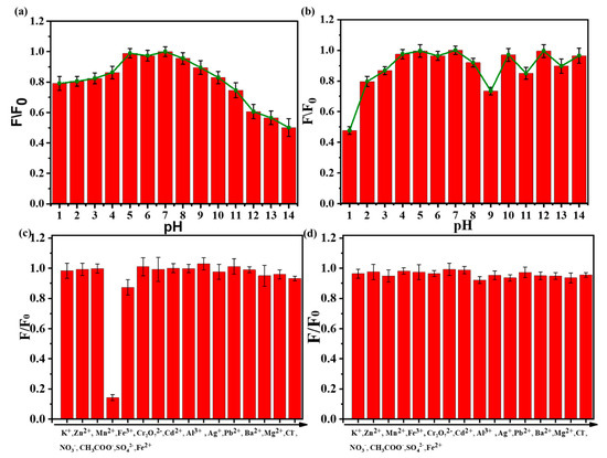 The pH value of the solution has a great influence on the fluorescent intensity of N-SCQDs and fluorescent dyes. Therefore, we studied the fluorescence intensity of N-SCQDs and rhodamine B at different pH values. As shown in Figure 5a, in a neutral solution, the fluorescence intensity of N-SCQDs was the strongest. When the pH became acid or alkaline, the fluorescence became weak. This may be caused by the different charges of the surface groups in the acid–base environment. Amino groups are positively charged in acidic environments and carboxyl groups are negatively charged in alkaline environments. The surface effect of functional groups affects the excited radiation transition efficiency of N-SCQDs, and finally leads to different fluorescence intensities [27]. As can be seen from Figure 5b, rhodamine B was almost unaffected by pH. Therefore, considering the influence of pH on N-SCQDs and rhodamine B, the pH value of the solution should be stabilized to neutral to avoid its interference with the detection of Fe3+.