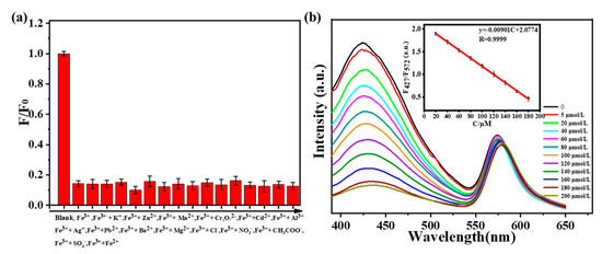 As shown in Figure 5c, the effect of various ions (K+, Zn2+, Mn2+, Fe3+, Cr2O72−, Cd2+, Al3+, Ag+, Pb2+, Ba2+, Mg2+, Cl−, NO3−, CH3COO−, SO42−, Fe2+) on the fluorescence of N-SCQDs was discussed. The quenching rate of N-SCQD fluorescence by Fe3+ could reach 85.8%, while the quenching rate of N-SCQD fluorescence by other ions was less than 13.2%, indicating that Fe3+ had a specific quenching effect on N-SCQD fluorescence compared with other ions, thus N-SCQDs could be used to specifically identify Fe3+. Subsequently, the effects of these ions on the fluorescence of rhodamine B were investigated (Figure 5d), and it was found that these ions had little effect on the fluorescence of rhodamine B—their quenching rates were all less than 5%, which provided a good condition for the construction of dual emission ratio fluorescent probes for the detection of Fe3+.
