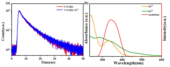 (a) Fluorescence attenuation curve of N-SCQDs with/without Fe3+; (b) fluorescence excitation spectrum of N-SCQDs and UV–vis absorption spectra of Fe3+ and Fe2+.