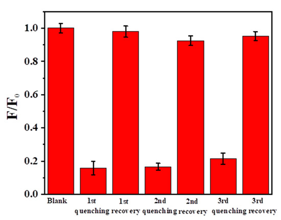 Due to the strong destructive ability of the oxidizing agent, the fluorescence of N-SCQDs would also be quenched while oxidizing Fe2+ to Fe3+. Therefore, the multiple oxidation/reduction of Fe was replaced by addition/reduction, which added additional Fe3+ after reduction instead of oxidation of Fe2+ to Fe3+. This measure would avoid the influence of oxidation on fluorescence. As shown in Figure 9, when ferric ion was added, the fluorescence of the blank was greatly reduced to 85.8% After the addition of ascorbic acid (100 μM), the fluorescence was almost completely restored. By repeating quenching and recovery three times, the fluorescence still recovered 94.3%, although the degree of fluorescence quenching and recovery gradually decreased. This may be due to that the ascorbic acid added each time is slightly excessive and the chelation with Fe3+/Fe2+ disrupts fluorescent recovery. This suggests that the sensor could potentially be reused in a limited time.