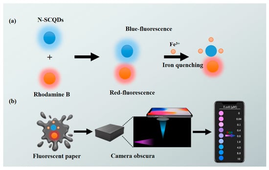 Illustration of (a) fabrication of a paper-based platform with rhodamine B–CQD ratio fluorescent probe, (b) on-site, visual and rapid detection of Fe3+ using smartphone.