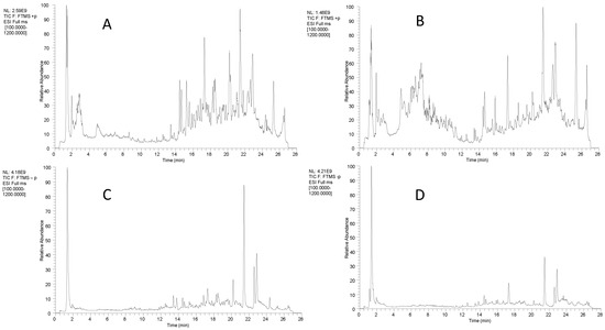 Positive and negative ion chromatograms of GTHP before and after fermentation. Note: Positive ion mode total ion flow plots before (A) and after (B) GTHP fermentation. Negative ion mode total ion flow plots before (C) and after (D) GTHP fermentation.