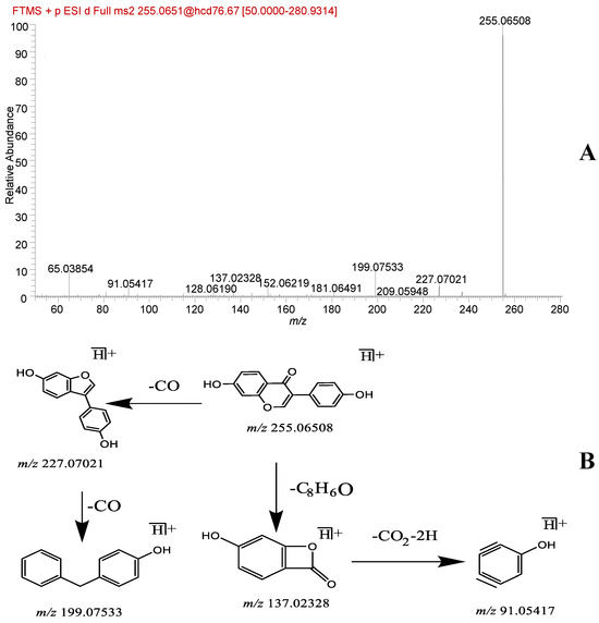 Daidzein fragmentation spectra (A) and cleavage pathway (B).