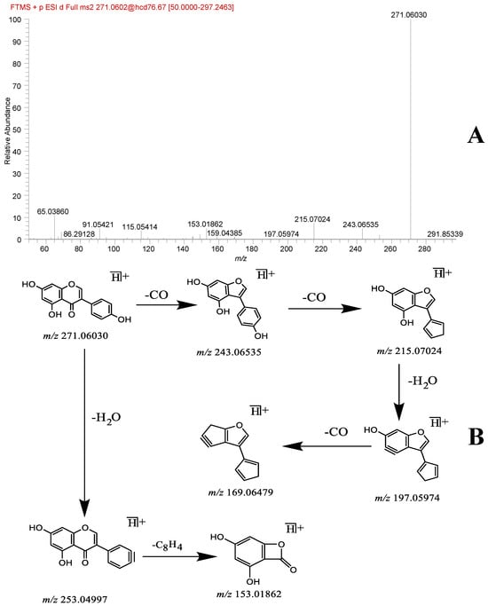 A total of 13 flavonoid analogs were identified, namely gaidzin, glycitin, puerarin, genistin, daidzein, chrysin, glycitein, 4’,7-dihydroxyflavanone, genistein, naringenin, fisetin, kaempferide, and ar-Turmerone. Compounds such as daidzein (42) and genistein (46) were used as examples. The primary mass spectrum showed daidzein m/z 255.06508 [M + H]+ quasi-molecular ion peaks with the chemical formula C15H10O4. The secondary fragmentation ion information includes m/z 227.07021 [M + H − CO]+, m/z 199.07533 [M + H − 2CO]+, m/z 137.02328 [M + H − C8H6O]+, and m/z 91.05417 [M + H − C8H6O − CO2 − 2H]+. This fragmentation pattern is similar to the cleavage pathway reported in the literature [18]. The primary mass spectrum of genistein yielded a quasi-molecular ion peak m/z 271.0603 [M + H]+ with a chemical formula of C15H10O5. Secondary fragment ions were present at m/z 253.04997 [M + H − H2O]+, 243.06535 [M + H − CO]+, 215.07024 [M + H − 2CO]+, 197.05974 [M + H − 2CO − H2O]+, 169.06479 [M + H − 3CO − H2O]+, and 153.01862 [M + H − H2O − C8H4]+. Similar cleavage pathways were reported in a previous study [19]. Moreover, the compounds were finally identified as daidzein and genistein through a comparison of the primary and secondary mass spectrometry cleavage fragments of the control with the extracted ion peak positions and relative retention times. The corresponding mass spectrometry cleavage pathways are shown in Figure 2 and Figure 3.