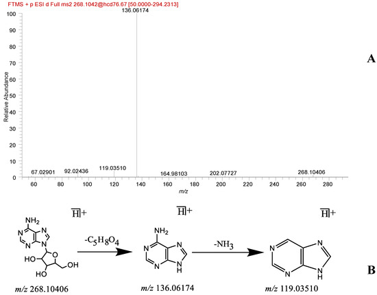Twelve organic acid-like and eight nucleoside-like components were identified in this experiment. The organic acid compounds included methylsuccinic acid, pantothenic acid, 3,4-dihydroxyphenylacetic acid, 3-hydroxy-3-methylbutanoic acid, 5-hydroxyindole-3-acetic acid, terephthalic acid, benzoic acid, mesaconic acid, linoleic acid, palmitoleic acid, palmitic acid, and oleic acid. The nucleoside analogs comprised cytidine, cytosine, 2,6-dihydroxypurine, uridine, adenosine, guanine, guanosine, and uracil. Compounds such as linoleic acid (71) and adenosine (12) were used as examples. The presence of linoleic acid, with the chemical formula C18H32O2, at the m/z 279.23306 [M − H]− quasi-molecular ion peak was identified in the primary mass spectrum. The secondary fragmentation ion information was m/z 261.22192 [M − H − H2O]−, which was consistent with the cleavage pathway reported in the literature [24]. The primary mass spectrum of adenosine yielded a quasi-molecular ion peak at m/z 268.10406 [M + H]+ with the chemical formula C10H13N5O4. Secondary fragmentation ion information included m/z 136.06174 [M + H − C5H9O4]+ and 119.03510 [M + H − NH3]+, which aligns with the cleavage pathway reported in the literature [16]. The compound was finally identified as adenosine through a comparison of the primary and secondary mass spectrometry cleavage fragments of the control with the extracted ion peak positions and relative retention times. The corresponding mass spectrometry cleavage pathway is shown in Figure 4.