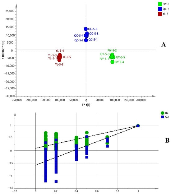 OPLS-DA analysis (A) and model replacement test (B) of pre- and post-fermented GTHP. Note: “FJY-5” indicates that the fermented samples were extracted five times. “YL-5” indicates that the samples before fermentation were extracted five times. “QC-5” denotes a set of five quality control samples taken before and after fermentation. YL-5-1–5, FJH-5-1–5, and QC-5-1–5 represent the injection numbers of the five samples taken before fermentation, after fermentation, and for quality control purposes, respectively.