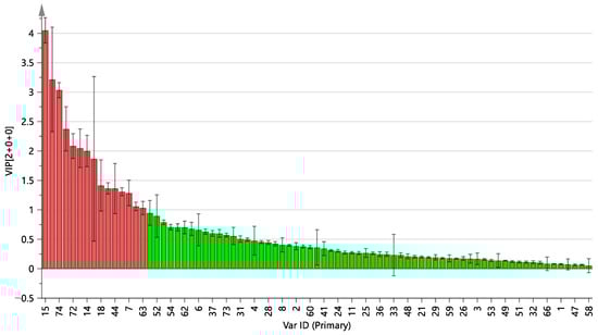 Plot of VIP values of GTHP and QC before and after fermentation. Note: Red indicates VIP value > 1; green indicates VIP value < 1.