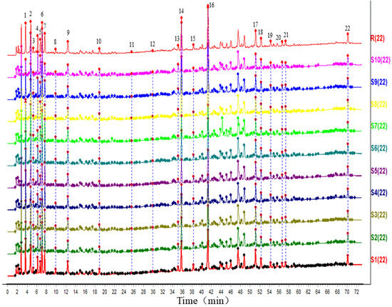 Ten batches of fermented GTHP samples. Note: S1–S7 refer to GTHP fermented by Luoyang Wokang Pharmaceutical Co. S8–S10 refer to GTHP fermented by Jiangsu Shenhua Pharmaceutical Co. R represents the control spectrum generated by 22 identified peaks.