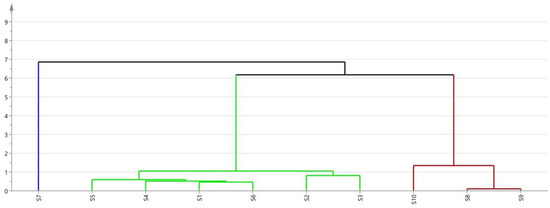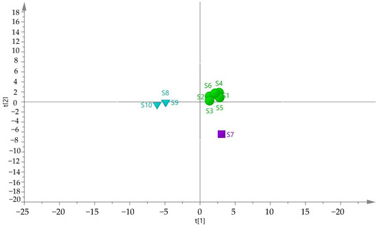 Ten batches of fermented GTHP samples (S1–S10) were prepared as solutions according to the method outlined in Section 4.2.2 and then injected for analysis as outlined in Section 4.3.2. The chromatograms were imported into the “Traditional Chinese Medicine Chromatographic Fingerprint Similarity Evaluation System (2012 version)”. The chromatogram of sample S1 was used as the reference, and multi-point correction was performed to generate superimposed chromatograms and the control chromatograms (R). Twenty-two peaks were identified, and the results are shown in Figure 7. The peak areas of the plots were subjected to principal component analysis (PCA) and cluster analysis (CA) using SIMCA 14.1 software. The results are depicted in Figure 8 and Figure 9, respectively. In the PCA analysis, R2X and Q2 values in PCA were 0.968 and 0.856, respectively. The PCA and CA can be utilized to categorize the ten batches of GTHP into three groups. Samples S1–S6 belong to the first category, S7 belongs to the second category, and samples S8–S10 belong to the third category. Samples S1–S7 were obtained from the same manufacturer, and they formed a distinct cluster, possibly influenced by seasonal fermentation. These findings indicate variations between GTHP from different manufacturers and batches. The results of similarity evaluation are presented in Table 2. The similarity between the samples of each batch and the control atlas was ≥0.971, indicating minimal differences in the quality of samples from different batches and manufacturers.