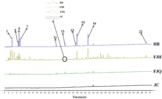 HPLC profiles of GTHP samples before and after fermentation. Note: “JC” blank solution; “FJQ” pre-fermentation GTHP solution; “FJH” post-fermentation GTHP solution; “HB” mixed reference solution; uracil (1), guanosine (5), adenosine (6), 5-HMF (7), daidzin (11), genistin (12), glycitein (13), daidzein (14), genistein (16) and ergosterol (22) are consistent with the fingerprinted peak numbers.