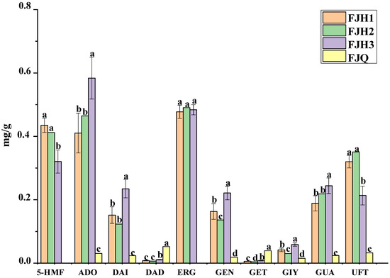 The results of the ten target compounds in GTHP were analyzed using SPSS 26.0 and Origin 2018 software. Note: Different letters for the same component indicate significant differences at p < 0.05. 5-hydroxymethylfurfural (5-HMF), adenosine (ADO), daidzein (DAI), daidzin (DAD), ergosterol (ERG), genistein (GEN), genistin (GET), glycitein (GIY), guanosine (GUA), and uracil (UFT).
