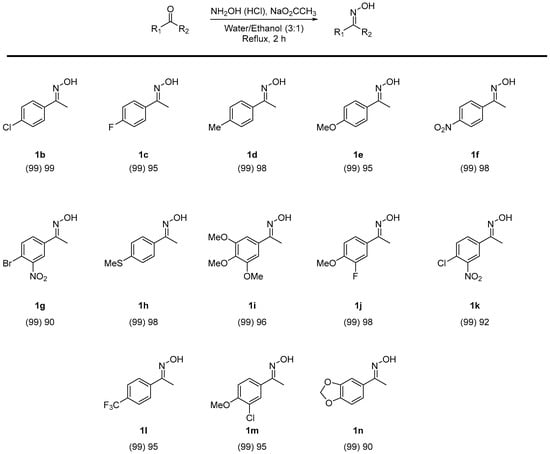 Due to a lack of commercially available oximes, 13 additional oximes were synthesized [32] from their respective ketones with hydroxylamine, in excellent yields of 90–99% (Chart 1).