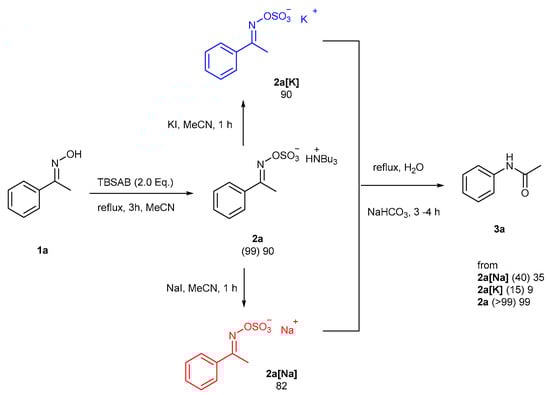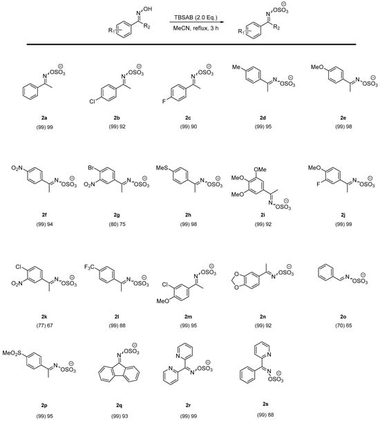 Attempts to optimize the O-oxime sulfation step with TBSAB are reported in Table 1 using the model substrate 1-phenylethan-1-one oxime (1a). The optimal conditions identified (Table 1, entry 1) required 2.0 equivalents of TBSAB in acetonitrile at 90 °C for 3 h, consistent with the O-sulfation of alcohol functional groups [30].