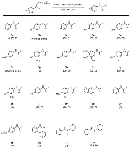 The rationale for additional TBSAB being required is to return the formation of any trace oxime by-product (1a) to a competent reaction partner (2a) and increase the overall conversion to the desired amide product (3a) and concomitantly improve the purification protocol. The sulfur trioxide group in TBSAB may also activate the ylideneamino sulfate via coordination to the oxygen or the formation of pyrosulfate via analogy to the reported reactivity of sulfur trioxide-dioxane [23].