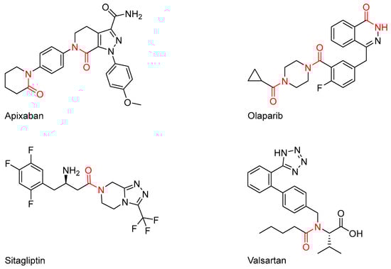 The amide functional group is one of the most important and widely encountered structural units in organic chemistry and biochemistry. The amide bond is commonly found in bioactive drug molecules including valsartan, an angiotensin receptor blocker (ARB) [1]; sitagliptin, an anti-diabetic medicine used to treat type-2 diabetes [2]; olaparib, a PARP inhibitor used to treat BRCA-mutated advanced ovarian cancer [3]; and apixaban, an anti-coagulant used to prevent stroke in nonvalvular atrial fibrillation via the inhibition of Factor Xa (Figure 1) [4].