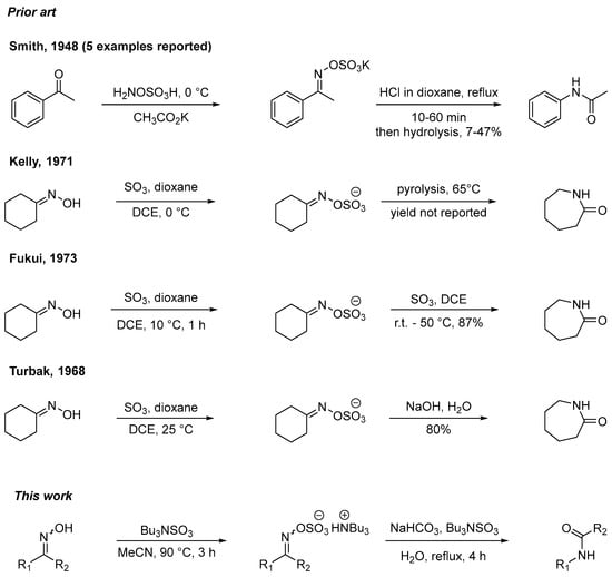 The use of reactive liquid sulfur trioxide in dioxane resulted in the isolation of the O-sulfate of cyclohexanone oxime [22,23,24]. Kelly observed that cyclohexanone oxime sulfate undergoes exothermic rearrangement under mild heating [22]. This contrasts with the work of Fukui who did not observe this phenomenon but instead explored a range of Lewis bases (alkylamines, arylamines), Lewis acids (sulfur trioxide, zinc chloride, tin tetrachloride), hydrochloric acid, water, and methanol-mediated effects on the cyclohexanone oxime sulfate intermediate [23]. It was found that sulfur trioxide was an optimal additive for the rearrangement step to caprolactam in this single example [23]. A series of complexing agents (pyridine, dioxane, triethyl phosphate, DMF) with sulfur trioxide have been explored to prepare caprolactam via the O-sulfate and subsequent treatment with aqueous sodium hydroxide [24].