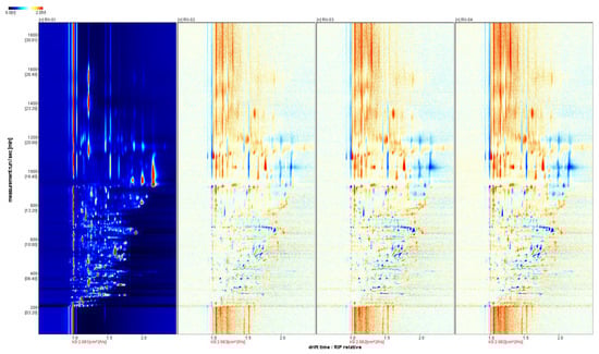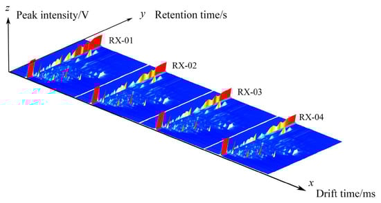 The three coordinate axes represent the migration time (x-axis), the retention time (y-axis), and the signal peak intensity (z-axis). From the figure, you can intuitively observe the differences in the volatile organic compounds in the different samples. From Figure 3, it can be seen that a blue color exists in the right-side region of RX-02, RX-03, and RX-04, which means that the concentration of the substance is lower than the reference concentration. In addition, a red color is found in the left side region, which means that the concentration of the substance is higher than the reference. It can be concluded that there are large differences in the content of the multiple VOCs, which is consistent with the results that were obtained from the 3D spectra and the top view.