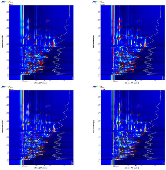 By projecting the three-dimensional GC-IMS spectra, four groups of two-dimensional GC-IMS images of olibanum can be obtained, as shown in Figure 2.