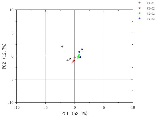 By analyzing the PCA results, it was found that PC1 and PC2 were 53.1% and 12.7%, respectively, and the cumulative contribution rate was 65.8%. The PCA results confirmed that there was a significant difference between the control group and the other three groups and the samples in each group were relatively different. After clustering, the repeatability was good in each group, the data similarity was high, and the results were relatively accurate. The results of PLS-DA were clearly separated among the four groups, thereby indicating that the differences between the groups are large. According to the results of the clustering heat map, it could be seen that RX-01 and RX-02 were closer and could be grouped into one category.