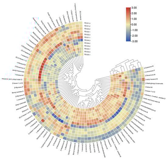 Cluster analysis (CA) is the grouping of data objects based on the information found in the data describing the objects and their relationships []. In order to further build the identification model, this study used heat maps to visualize the data between samples and imported 81 volatile component peaks in olibanum after irradiation at 0 kGy, 1.5 kGy, 3.0 kGy, and 6.0 kGy 60Co doses into TBtools. The cluster analysis is depicted in Figure 7. It can be seen that RX-01 and RX-02 were in the same category and that RX-03 and RX-04 were also in the same category.