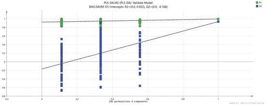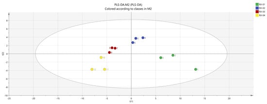 SIMCA was used to conduct a partial least squares discriminant analysis (PLS-DA) [] of each sample with a supervised pattern recognition method to observe the differences in olibanum after 60Co irradiation at 0 kGy, 1.5 kGy, 3 kGy, and 6 kGy doses. The results are shown in Figure 8. It can be seen from the figure that the main areas of olibanum irradiated with different doses do not intersect with each other and are clearly distinguished. RX-01 and RX-02 are both on the right side of the coordinate axis and the distance is farther than the other samples. This indicates that the difference in the VOCs is small, which is consistent with the PCA results. Additionally, according to the processed data, R2X = 0.878, R2Y = 0.992, and Q2 = 0.894, when R2 and Q2 are greater than 0.5, this indicates that the model has relatively accurate generalization and predictive abilities.