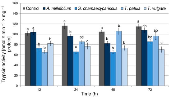 The obtained results showed that treatment with the tested Asteraceae EOs affected the activity of trypsin in R. padi tissues (F(4,40) = 47.29, p < 0.001) (Figure 1). Moreover, time had a significant effect on the enzyme activity (F(3,40) = 4.77, p < 0.01). There was also a significant interaction between treatment and time in trypsin activity (F(12,40) = 6.35, p < 0.001). Compared to the control, the enzyme activity significantly decreased after the application of the tested essential oils during almost all experimental periods, except for the oil of A. millefolium at 12 and 72 h and for T. patula oil at 48 and 72 h. The highest inhibition of trypsin activity within aphid tissues was shown after treatment with essential oil from S. chamaecyparissus (26–43%) and T. vulgare (19–39%).