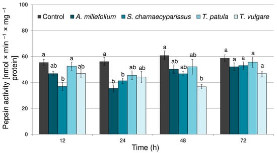 The activity of pepsin (mean ± SE) in apterous females of Rhopalosiphum padi after treatment with selected Asteraceae essential oils. Different letters indicate significant differences for each time period separately at p < 0.05 (Tukey’s test).