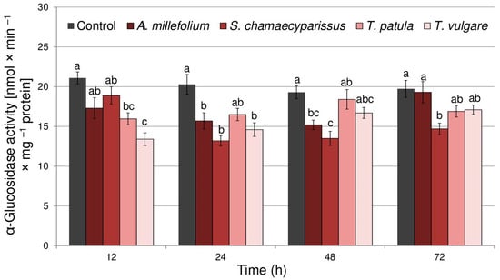 The activity of α-glucosidase (mean ± SE) in apterous females of Rhopalosiphum padi after treatment with selected Asteraceae essential oils. Different letters indicate significant differences for each time period separately at p < 0.05 (Tukey’s test).