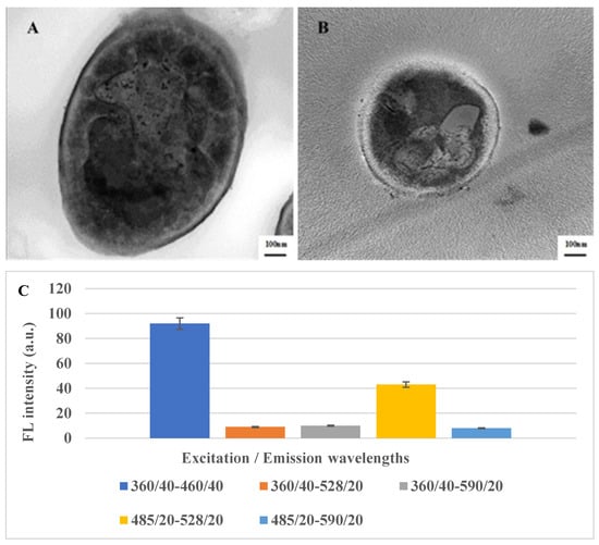 LSDV and SPV were morphologically investigated using TEM (Figure 1A,B) to compare the morphological characters of both viruses. The results showed that the shape and size of the two viruses are highly similar, presenting a typical enveloped brick-like shape with rounded ends and sizes of 290 and 260 nm, respectively, as reported by the authors of reference [55]. The fluorescence absorption of LSDV was detected at different Excitation/Emission wavelengths (360/40-460/40, 360/40-528/20, 360/40-590/20, 485/20-528/20, 485/20-590/20, respectively). The highest fluorescence intensity was recorded at Excitation/Emission wavelength (360/40-460/40) (Figure 1C).