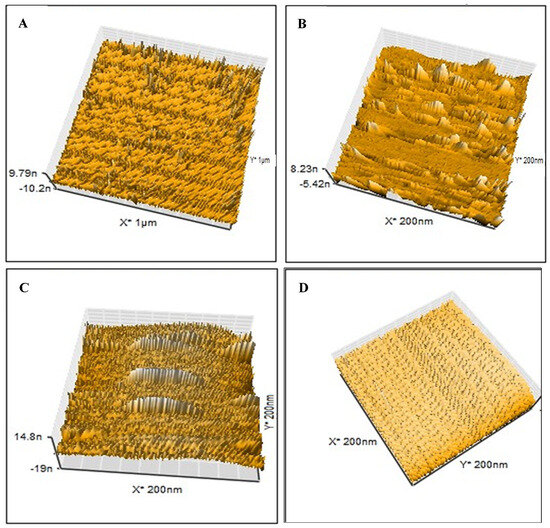 AFM images (3D) of (A) the LSD virus used as a template at a scale of 1 µm with sizes ranging from 290 to 295 nm; (B) the imprinted bare MIPs following polymerization at a scale of 200 nm; (C) LSDV can rebind in the specific sites on the bare MIPs after template removal at a scale of 200 nm. (D) NIPs formed without LSDV template virus with smooth surface at scale of 200 nm.