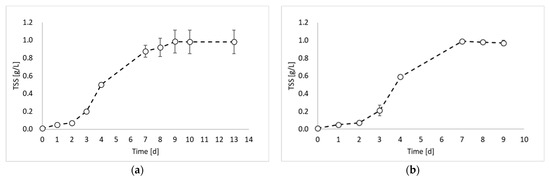Figure 1 shows that the maximum TSS value was similar for all experiments and ranged between 0.98 and 0.99 gTSS/L. This result was due to the experimental conditions, which were identical in all experimental tests (except the inoculum). During the first experiment (Figure 1a), a lag phase of about 2 days occurred, followed by an increase in the TSS values until day 9. After day 9, it is possible to observe the stationary phase. The maximum biomass growth rate was observed between day 2 and day 3 with a value of 0.0124 gTSS/L h. The second experiment (Figure 1b) showed very similar results, with a lag phase of two days and a maximum growth rate of 0.0145 gTSS/L h between day 3 and day 4. Conversely, a significant improvement in the biomass growth was obtained in the third experiment (Figure 1c), which was conducted by using the inoculum of the previous reactor, sampled during the exponential phase. Indeed, in this experiment, no lag phase was observed, and the maximum growth rate was reached already between day 1 and day 2. Moreover, the growth rate value was 0.0158 gTSS/L h. On day 3, the biomass concentration reached the 80% of the maximum achieved concentration, with a 98% increase compared to test 1 and 92% increase compared to test 2. Such observations confirm that by inoculating reactors with microorganisms from the exponential growth phase, the process duration can be considerably reduced.