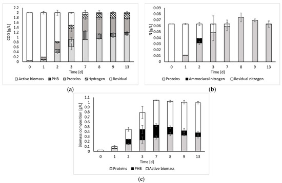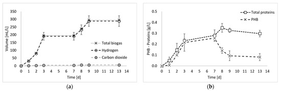 During the final phase of the process (after day 7), hydrogen was produced again. This result is in accordance with previous studies reporting hydrogen production even at the beginning of the stationary phase [12]. After day 9, hydrogen was not produced anymore. In this final process phase, a decrease in the PHB accumulation was observed, as it was consumed for biomass maintenance. Indeed, in accordance with the feast–famine theory [13], PPB use PHB as a carbon reserve for their survival when nutrients become scarce. Consistently with this observation, the decrease in PHB corresponded to an increase in protein production, which reached the maximum concentration during this final phase of the process.