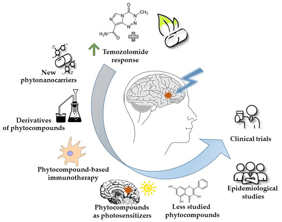 The idea of targeting GBM using phytocompounds (i.e., secondary metabolites of plants) has a long history. In this regard, several compounds, i.e., curcumin, isothiocyanates, resveratrol, and epigallocatechin-3-gallate (EGCG), have been evaluated in numerous studies, showing activity against GBM cells. However, the implementation of the phytocompound laboratory research into clinical reality is still unsatisfactory. Poor bioavailability, low tumor accumulation, and rapid clearance in vivo compromise the efficacy of phytocompounds in clinical trials. Thus, new ideas are being developed, and new approaches are being evaluated in order to upgrade the phytotherapy of GBM to a satisfactory level (Figure 1). In this context, the innovative phytotherapy of GBM includes the development of BBB-penetrating agents, such as nanoformulations of active phytochemicals. Research shows that the solubility, stability, and pharmacokinetic and pharmacodynamic characteristics of phytocompounds can be improved with the use of nanoformulations [10]. Moreover, chemical modifications of phytochemicals to improve their bioavailability have also been developed and tested, with promising results. Additionally, numerous studies provide evidence that combinatorial treatment of chemo-/radio-therapy or immunotherapy, together with phytochemical-mediated therapy, is beneficial and prolongs patients’ survival. Furthermore, the use of phytocompounds as photosensitizers provides a new way of addressing barriers in GBM therapy. Ultimately, the investigation of ‘forgotten compounds’ from lichens, mushrooms, or plants gives hope for a breakthrough in GBM therapy. In this article, we present the most up-to-date revision of the new, promising avenues and major achievements in phytocompounds research for GBM therapy, bringing the development of efficacious anti-GBM treatments closer.