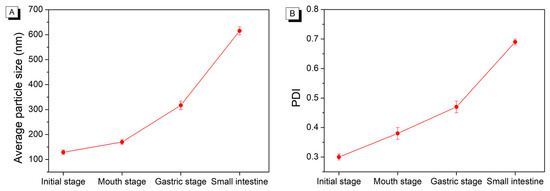 As depicted in Figure 1A, the average particle size of initial AST-loaded liposomes was 128.90 ± 9.63 nm. The polydispersity index (PDI) is a measurement of the size distribution of liposomes, ranging from 0 to 1.0 [16]. A high PDI value indicates a broad size distribution, which corresponds to a less homogeneous particle size [17]. The initial AST-loaded liposomes presented a PDI of 0.30 ± 0.01, as shown in Figure 1B, indicating a fairly uniform distribution. Compared to the initial AST-loaded liposomes, it exhibited slight changes in particle size or size distribution after being incubated in simulated saliva fluid. Additionally, the particle size and size distribution of AST-loaded liposomes increased while passing through from the mouth to the gastric digestion stage. At the same time, it was notable that the size distribution of AST-loaded liposomes still retained unimodal after the simulated gastric fluid digestion stage (Figure 2). The outcomes suggested AST-loaded liposomes were stable under in vitro gastric digestion conditions owing to the protection of liposomal membrane from fusion and aggregation at low pH values. It was also found that the average particle size of AST-loaded liposomes increased gradually from the initial stage to the simulated intestinal fluid stage. The possible cause could be the fusion, aggregation, and swelling of liposomal particles. On the other hand, free fatty acids released from the phospholipid bilayer might aggregate and adsorb on the surface of liposomes [18]. After incubation in simulated intestinal fluid, it should be noted that the average particle size of AST-loaded liposomes increased steeply from 317.00 ± 17.33 nm to 615.40 ± 16.12 nm. Pancreatin is a compound that consists of pancreatic lipase, trypsin, and amylase. Phospholipids in liposomes were hydrolyzed by the catalytic action of pancreatic lipase, which released lysophospholipids and fatty acids during the small intestine digestion stage. Meanwhile, the AST released from liposomes, bile salts, phospholipids, and fatty acids formed larger mixed micelles due to the strong surface-active nature of bile salts, resulting in a considerable increase in particle size.