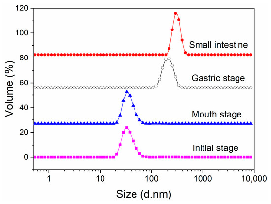 The simulated gastrointestinal tract (GIT) model was adopted to assess the digestion behavior of AST-loaded liposomes. The three-stage gastrointestinal tract (GIT) model consisted of the mouth, stomach, and small intestine stages [31].