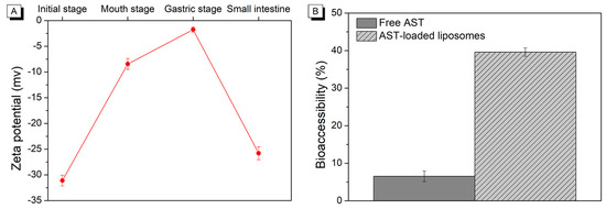 Change in zeta potential of AST-liposomes (A) and AST bioaccessibility of free AST and AST-liposomes during in vitro digestion (B).