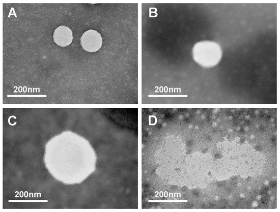 Change in microstructure (determined by transmission electron microscopy) of AST-liposomes during in vitro digestion: initial stage (A), mouth stage (B), gastric stage (C), and intestine stage (D).