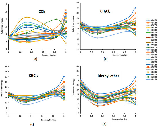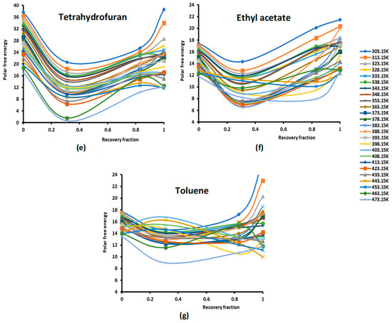 Evolution of the polar free interaction energy ( (kJ/mol) of different polar solvents as a function of the recovery fraction of PMMA adsorbed on silica at different temperatures: (a) CCl4; (b) CH2Cl2; (c) CHCl3; (d) diethyl ether; (e) tetrahydrofuran (THF); (f) ethyl acetate; and (g) toluene.