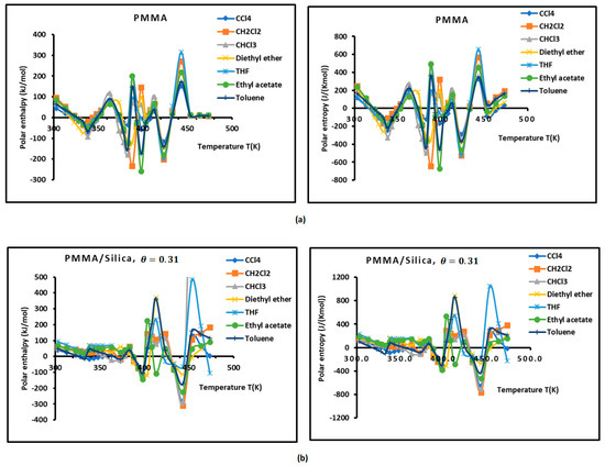 To determine the polar enthalpy ( and entropy ( of the interaction between solvents and composites, relations (8) and (9) were applied on the non-linear variations of ( of the adsorbed polar solvents by taking small parabolic portions of the representative curves. The values of ( and ( are given in Tables S9–S13. An important difference in the behavior of the various solid surfaces is shown in Tables S4–S8, strongly depending on the temperature and on the coverage rate. To highlight the important effect of the temperature and the adsorption of PMMA on silica particles, the results are plotted in Figure 2 and Figure 3, giving the curves of the enthalpy ( and entropy ( of the polar solvents adsorbed on the various solid substrates as a function of the temperature by varying the coverage rate of the adsorption of PMMA on silica. The results in Figure 2 concerning the silica particles are plotted independently of the temperature; indeed, a perfect linearity is observed in the variations of the free polar energy ( of all the adsorbed polar molecules, and constants values of ( and () were obtained in the case of silica particles (Figure 2, Table S8).