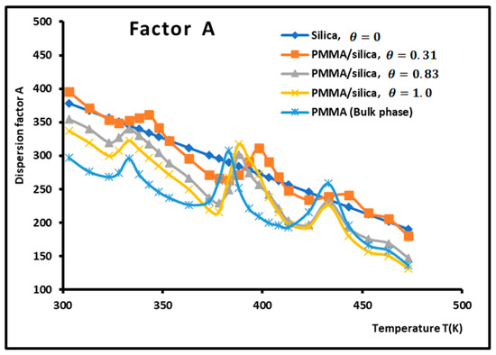 An intersting and original result is noted in the variations of polar enethalpy and entropy given in Figure 3, showing four minima of the various curves mentioning specific and particular temperatures. In previous papers [39,56,57,58,60], three transition temperatures were observed with PMMA and PMMA/silica at different coverages of PMMA on the silica particles, respectively, related to beta-relaxation (), glass transition (), and other liquid–liquid transitions (). A shift in these transition temperatures was observed in the case of the adsorption of PMMA on metallic oxides, reaching 20 °C when PMMA was adsorbed on silica.