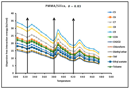 The larger separation was found between silica particles and solvents, while the closest distance was obtained for a recovery fraction of PMMA adsorbed on silica. When comparing the curves of Figure 6 and Figure 7, it is noted that for , the minimum of the dispersive energy corresponds to the maximum of the separation distance. Indeed, the minimum of attractive energy is necessary equivalent to the higher separation distance. Once again, the curves of Figure 7 show the presence of maxima at the transition temperatures.