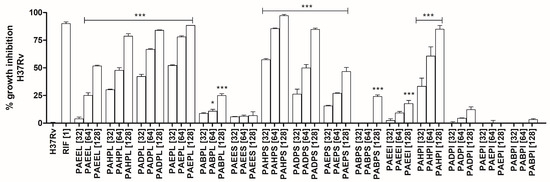 Inhibition of Mycobacterium tuberculosis H37Rv growth after treatment with extracts and partitions of Piper aduncum. MTT assay after 5 days of incubation in the presence of samples at concentrations of 32, 64, and 128 µg/mL. Positive control: M. tuberculosis H37Rv (1 × 106 CFU/mL) treated with rifampicin (treatment drug), and negative control M. tuberculosis H37Rv untreated (1 × 106 CFU/mL). Statistical analysis: One-way ANOVA followed by the Tukey test. *** p < 0.001 and * p < 0.05 compared to negative control. Triplicate results are represented as mean ± standard error. RIF—Rifampicin; PAEEL—Ethanolic extract from leaves; PAHPL—Hexane partition from leaves’ ethanolic extract; PADPL—Dichloromethane partition from leaves’ ethanolic extract; PAEPL—Ethyl acetate partition from leaves’ ethanolic extract; PABPL—Butanol partition from leaves’ ethanolic extract; PAEES—Ethanolic extract from stems; PAHPS—Hexane partition from stems’ ethanolic extract; PADPS—Dichloromethane partition from stems’ ethanolic extract; PAEPS—Ethyl acetate partition from stems’ ethanolic extract; PABPS—Butanol partition from stems’ ethanolic extract; PAEEI—Ethanolic extract from inflorescences; PAHPI—Hexane partition from inflorescences’ ethanolic extract; PADPI—Dichloromethane partition from inflorescences’ ethanolic extract; PAEPI—Ethyl acetate partition from inflorescences’ ethanolic extract; PABPI—Butanol partition from inflorescences’ ethanolic extract.
