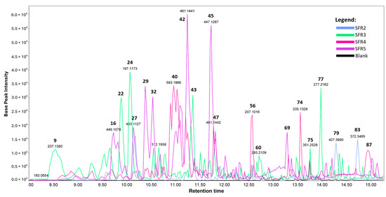 Overlaid chromatograms of base peak recorded (Rt 8.0 to 16.5 min) with UHPLC-HRMS/MS in positive ionization mode of fractions 2 to 5 (SFR2-SFR5) obtained using Sephadex LH-20 column chromatography of the bioactive ethyl acetate partition from the ethanolic extract of Piper aduncum L. The bold numbers in the peaks shown correspond to the substances described in the text and Table 2.