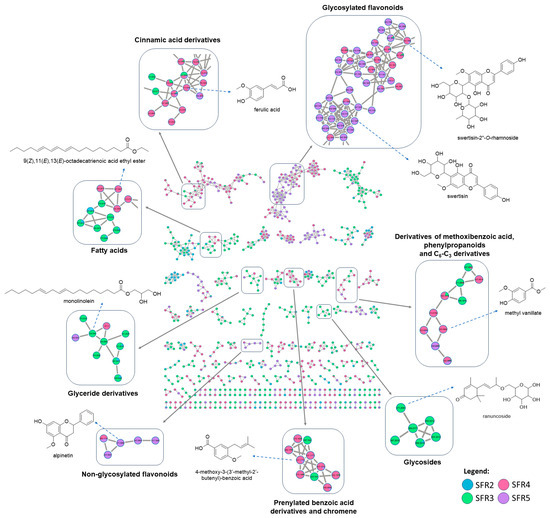 - The flavonoids wogonin (69, m/z 285.0758, [M+H]+) in SFR5, along with two glycosylated flavonoids, isoswertisin (32, m/z 447.1281, [M+H]+) and 7-(β-D-glucopyranosyloxy)-5-methoxy-2-(4-methoxyphenyl)-4H-1-benzopyran-4-one (42, m/z 461.1443, [M+H]+), with the latter being predominant in SFR5. These flavonoids did not cluster into the corresponding molecular families due to the low-intensity signals in the MS2 spectrum, preventing the calculation of similarity between spectra. The presence of fragment ions was observed in the raw data, allowing for the manual annotation of substances based on the similarity with MS2 spectra from libraries;