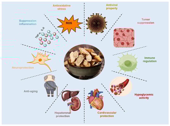 Astragali radix extract and its bioactive components have been found to have a wide range of beneficial effects under both normal and pathological conditions (Figure 1). These bioactive ingredients are excellent antioxidants, immunomodulators, and tumor inhibitors [5]. Additionally, they have significant effects on liver and kidney protection [5] and anti-aging, antiviral, cardiovascular protection [6], neuroprotection [27], hypoglycemia, and anti-inflammatory [28] effects. Astragalus contains active ingredients that could help lower blood pressure and reduce levels of triglyceride and total cholesterol in rats [29,30]. Studies have shown that these effects may also have therapeutic benefits for hypertension and hyperlipidemia.