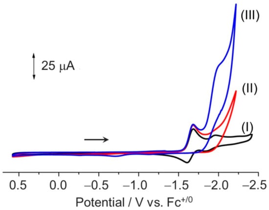 Cyclic voltammograms of complex 1 in CH3CN with 0.1 M nBu4NPF6 as the supporting electrolyte (I) under Ar; under CO2 (II) in the absence of and (III) in the presence of 4 M methanol. The arrow in the CV diagram represents the initial scan direction.