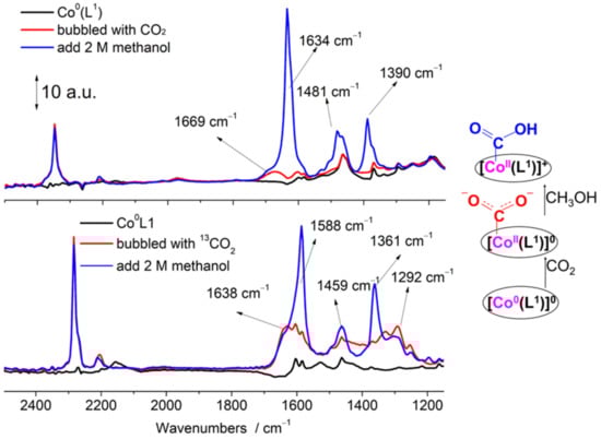 IR spectrum of freshly prepared [Co0(L1)]0 (black line), which is bubbled with dry CO2 (above) and 13CO2 (down) (red line), then 2 M methanol is added (blue line). These lines were recorded by in situ FTIR during the reaction process. The tests are performed in a CH3CN/THF (1:1) mixture under Ar or CO2 with 10.0 mM [Co0(L1)]0.