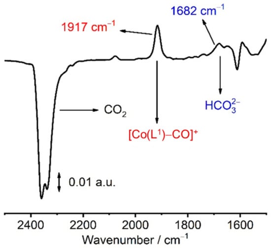As referred to in the DPV test of complex 1 under CO2, CO2 binding and the following reduction coincide with the CoI/0 couple (Figure S30). To investigate the subsequent reduction of the CO2-coordinated cobalt metallocarboxylate, in situ infrared spectroelectrochemistry (IR-SEC) experiments are performed at −1.85 V. The differential IR-SEC spectrum of 1 reveals a decrease in CO2 intensity around 2340 cm−1 and the emergence of a band at 1917 cm−1 (Figure 5). Complex 1 itself does not possess IR absorption modes with sufficient intensity that can be distinguished within the range of 1500 to 2500 cm−1, under varied electrolysis potential from −1.0 to −2.4 V, and in the absence of CO2. The absorption peak observed at 1917 cm−1 can be ascribed to the two-electron reduction species [CoI(L1)–CO]+ [26,49], which is obtained from through further reduction of [CoII(L1)–CO22−]0. Fujita and colleagues have reported that [CoI(macrocycle)–CO]+ (macrocycle = 5,7,7,12,14,14-hexamethyl-1,4,8,11-tetraazacyclotetradeca-4,11-diene) exhibits an absorption peak at 1916 cm−1 [49,50]. Upon reduction of complex 1 with 1 equiv of Cp*2Co under CO, a weak IR absorption band resembling [CoI(macrocycle)–CO]+ was observed at 1917 cm−1 (Figure S37). In the presence of 1 M methanol under the same experimental condition, two strong peaks at 1916 and 1664 cm−1 were ascribed to [CoI(L1)–CO]+ and the combination absorption of [CoII(L1)–COOH−]+, respectively (Figure S38). The differential IR-SEC spectrum of complex 2 was also recorded at −1.85 V. Similar to complex 1, the peak of the reduction species [CoI(L2)–CO]+ was also observed at 1917 cm−1. The findings suggest that complex 2 undergoes the same catalytic mechanism as complex 1. (Figure S39). Consequently, there will be further reductions of CO2-coordinated cobalt intermediates to generate CO.