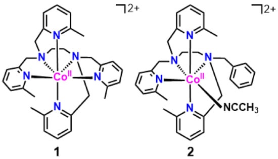 The molecular structures of complexes 1 and 2 were determined by single crystal X-ray crystallography (Figure 1). Complex 1 adopts a distorted octahedral geometry. The Co–N bond distances for two axial pyridyl–nitrogen atoms (Co–N5 (N6) = 2.292 (2.326) Å) are significantly longer than that of the other four nitrogen atoms on the equatorial plane (Co–N1 (N2, N3, N4) = 2.193 (2.164, 2.147, 2.186) Å). Two pyridine rings on the equatorial plane in complex 1 form an angle of extrusion of 34°. By replacing one of the 6-methylpyridinyls in 1 with phenyl, complex 2 features one CH3CN solvent molecule coordinated in the equatorial site. Complex 2 shows a normal octahedral geometry, however, its bond lengths and angles are very similar to those in complex 1. Detailed crystallographic data and processing parameters are collected in Tables S1 and S2.